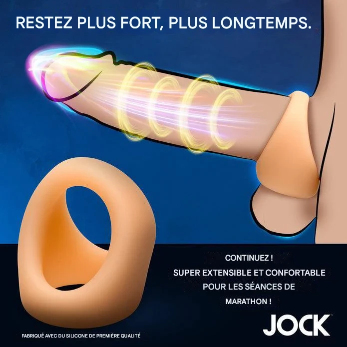 Intensifiez vos sensations avec l’anneau pénien et testicules en silicone Jock. Discret, souple et 100 % sûr, il améliore l’érection, stimule vos zones érogènes et prolonge le plaisir.
