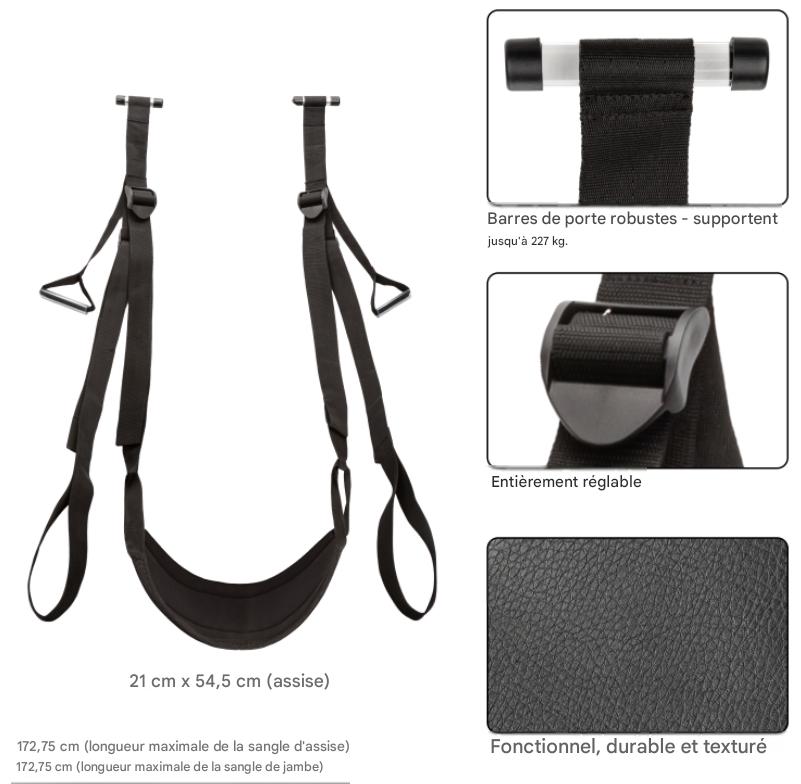 Par ailleurs, cette balançoire sexuelle ajustable comprend des sangles pour les pieds ainsi que des poignées de maintien. Grâce à ces éléments, il devient plus facile d’adapter la position selon vos envies, votre morphologie et le niveau de soutien recherché. De ce fait, la balançoire permet d’essayer plusieurs configurations tout en gardant un meilleur contrôle.