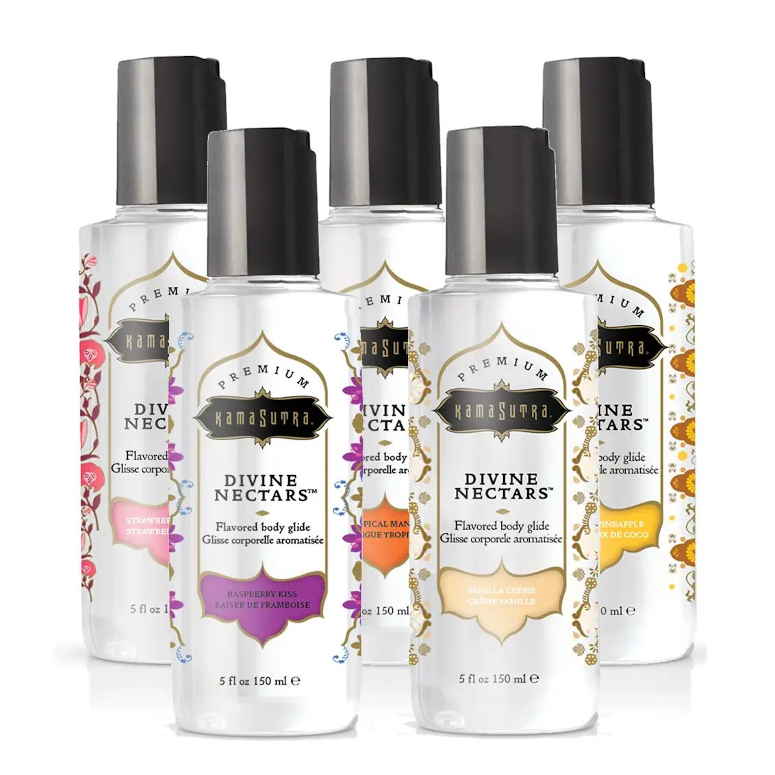 Divins Nectars de Kama Sutra. Lubrifiant aromatisés à base d’eau. Glisse soyeuse, saveurs gourmandes, non collant, utilisable sur tout le corps.