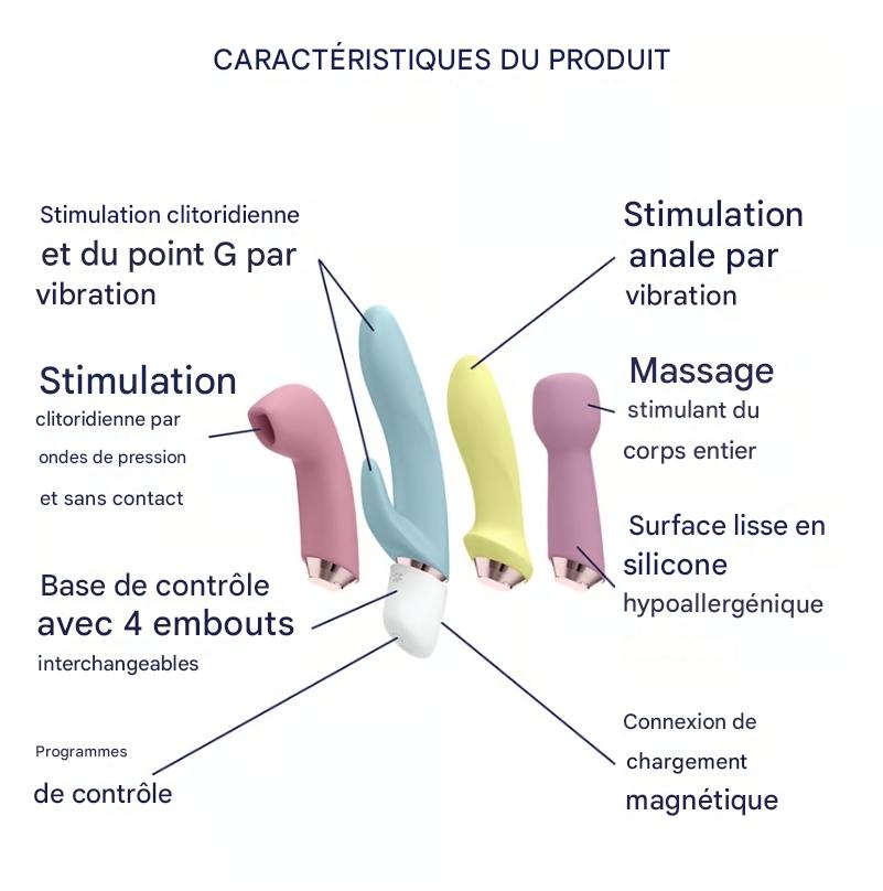 Le Kit de vibrateur Marvelous Four a été pensé pour les personnes qui souhaitent explorer plusieurs styles de stimulation avec un seul coffret. En effet, cet ensemble complet réunit quatre embouts interchangeables et un boîtier rechargeable compact, afin d’offrir une expérience plus variée, plus simple et plus personnalisée. Ainsi, que vous recherchiez une stimulation clitoridienne par ondes de pression, un vibrateur lapin, un mini vibromasseur ou un accessoire polyvalent pour le point G, le point P ou une utilisation anale, ce kit s’adapte facilement à vos envies.