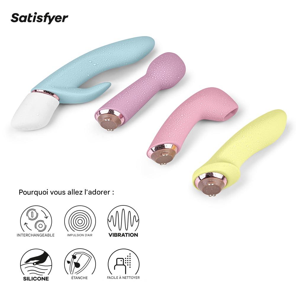 Kit de vibrateur Marvelous Four avec 4 embouts interchangeables : Air Pulse, lapin, vibromasseur et point G / point P / anal. Rechargeable USB, silicone doux et 12 modes vibrants.