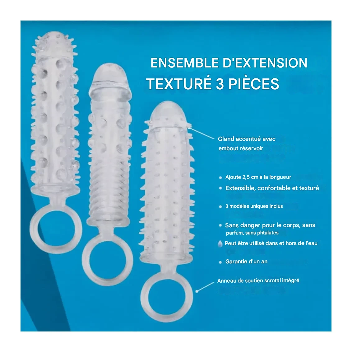 Kit d’extension 3 pièces texturées transparent pour pénis : manchons texturés pour plus de longueur, plus de circonférence et plus de sensations