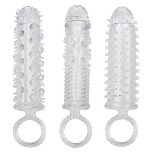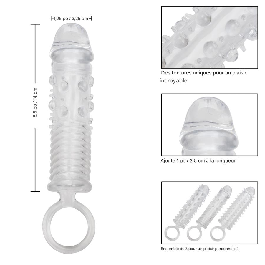 Kit d’extension 3 pièces texturées transparent pour pénis : trois manchons étroits en TPE texturé (côtes intérieures/extérieures) pour augmenter la circonférence et améliorer le maintien.