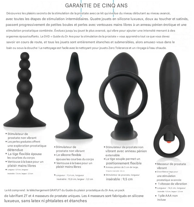 Libérez le plaisir prostatique et explorez de nouvelles sensations avec le kit d’introduction à la prostate, un ensemble complet pensé pour accompagner chaque étape, du débutant à l’utilisateur avancé. En effet, ce kit 4-en-1 réunit des textures variées, des formes évolutives et une stimulation ciblée du point P, afin d’offrir une expérience simultanément progressive, confortable et intensément satisfaisante. Ainsi, chaque séance devient une découverte maîtrisée, à votre rythme.