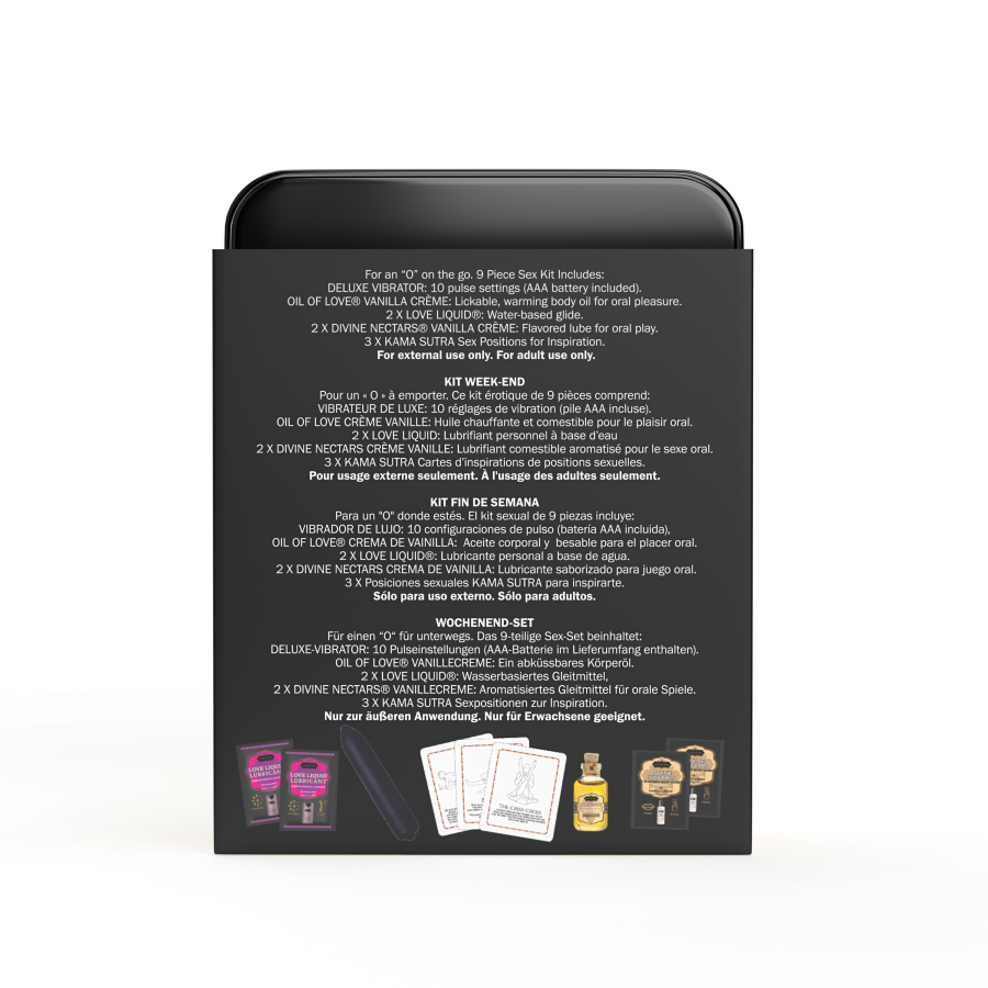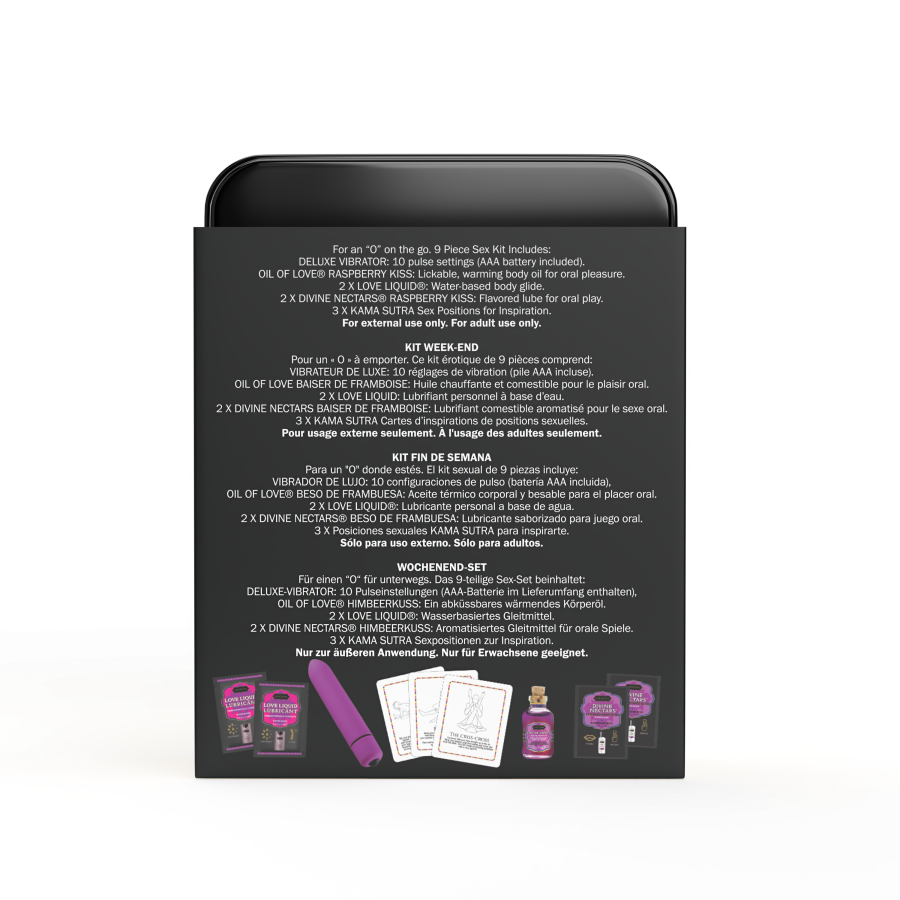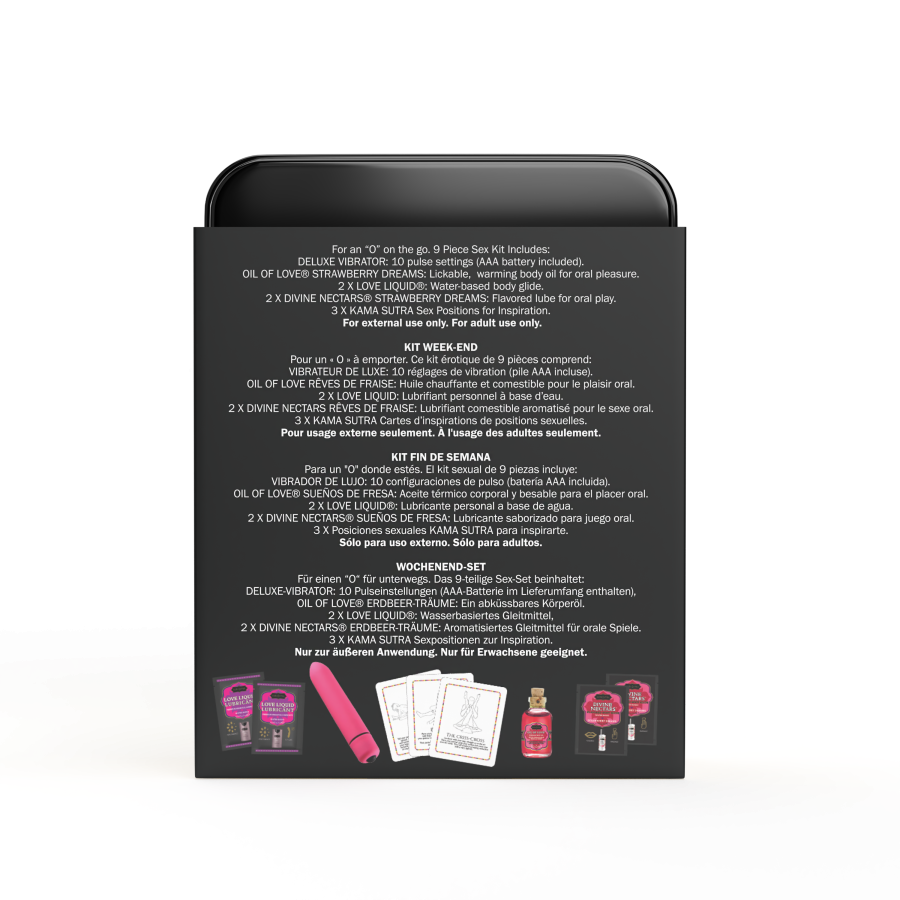 Vibe Weekender Kit : coffret intime de voyage avec mini vibromasseur, lubrifiants aromatisés, gel chauffant et cartes érotiques. Ce kit est offert en 5 saveurs délicieuses.