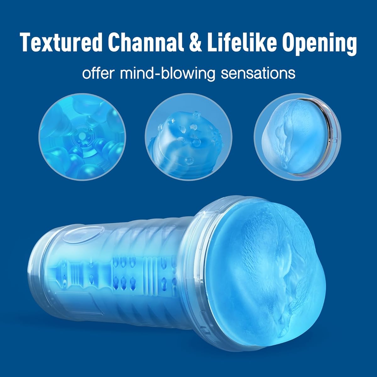 Masturbateur réaliste Cristal Bleu : entrée ultra-réaliste, tunnel texturé, matériau doux et boîtier transparent. Ergonomique, démontable et facile à nettoyer.
