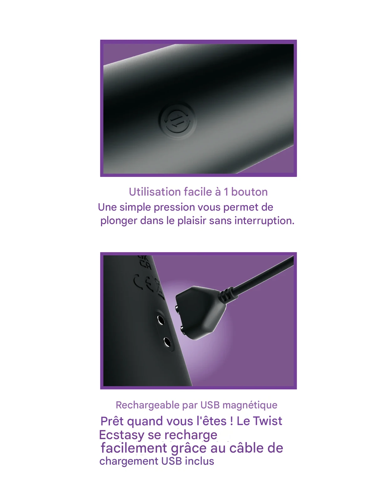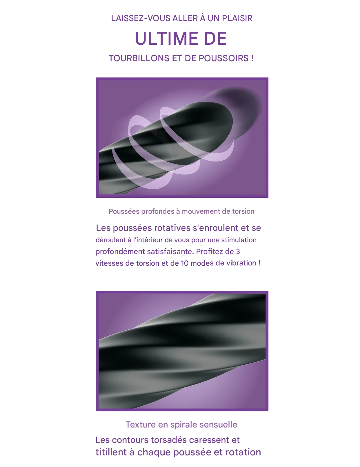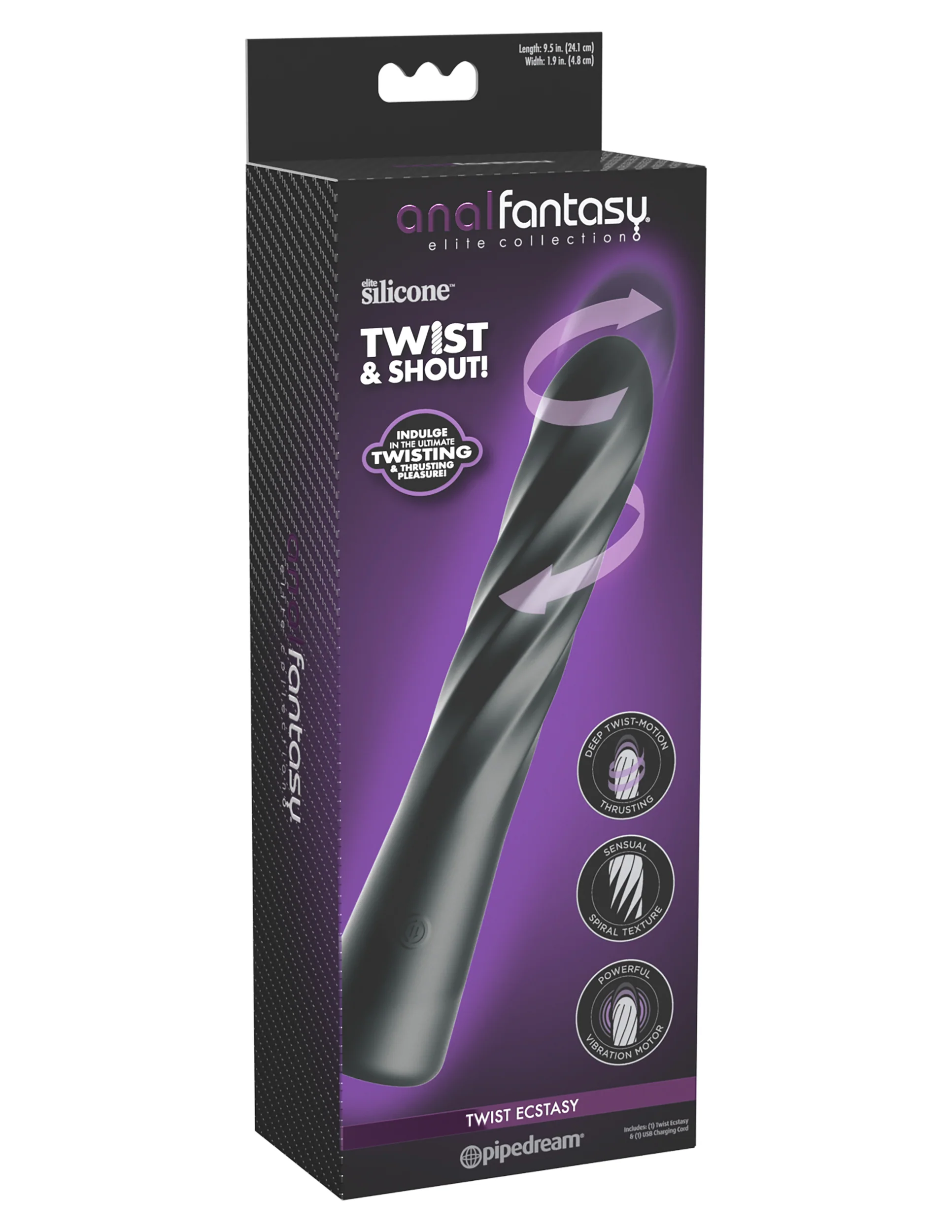 Découvrez le vibrateur anal Elite Twist Ecstasy : avec mouvement rotatif, action de poussée, texture spiralée, 10 modes de vibration, recharge USB et design IPX6.