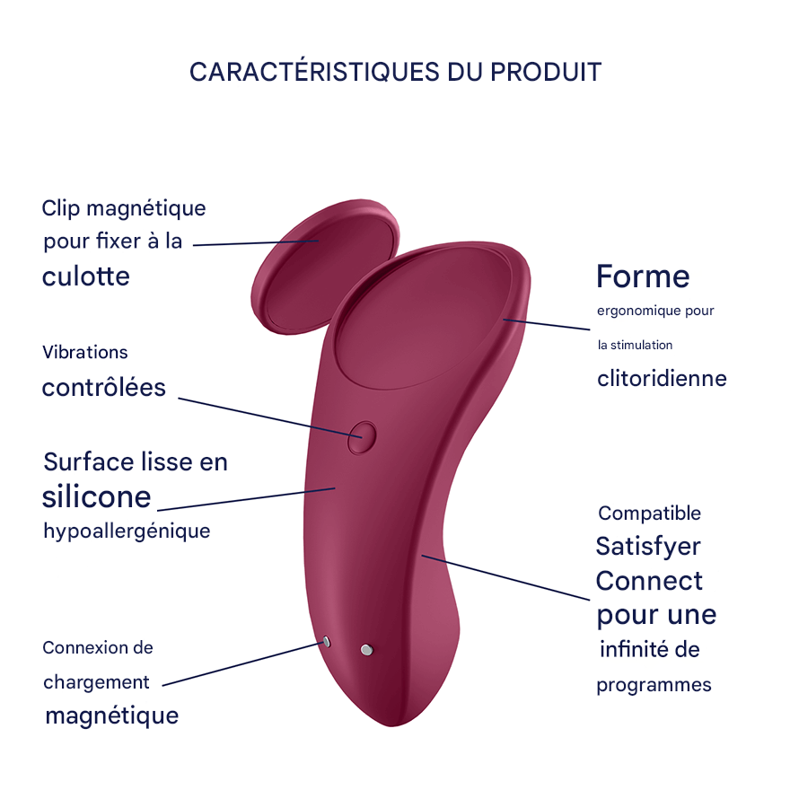 Vibrateur pour culotte Secret et Sexy avec fixation magnétique. Vibrations intenses et contrôle via l’application Satisfyer Connect. Silicone ultra-doux et stimulation clitoridienne discrète.