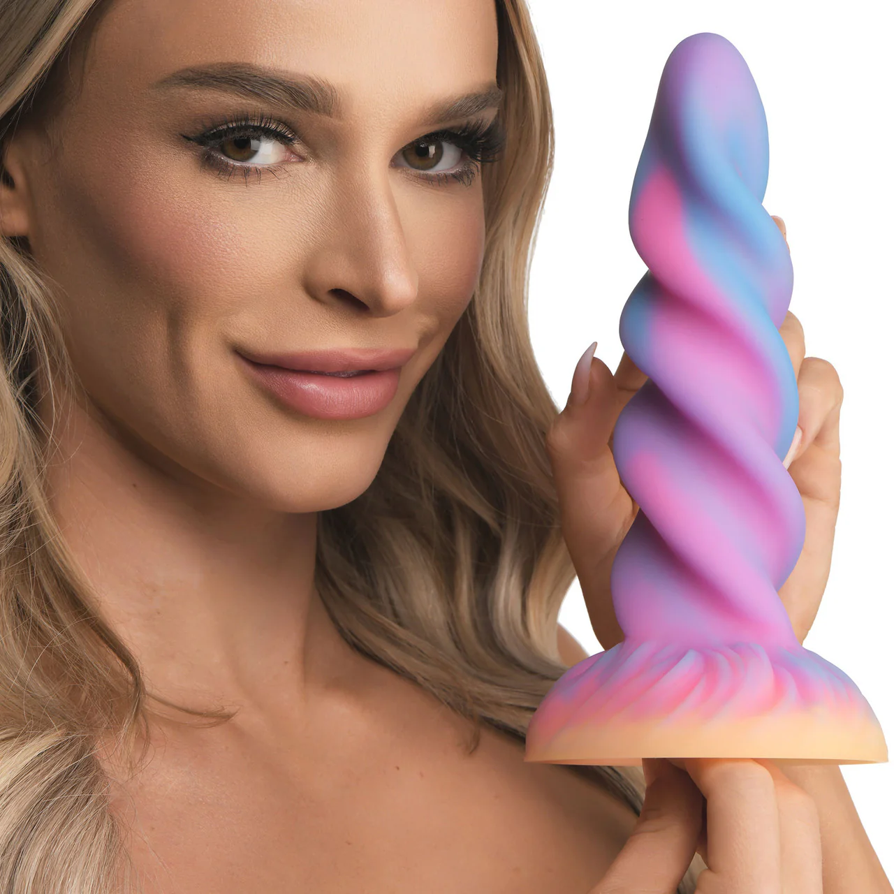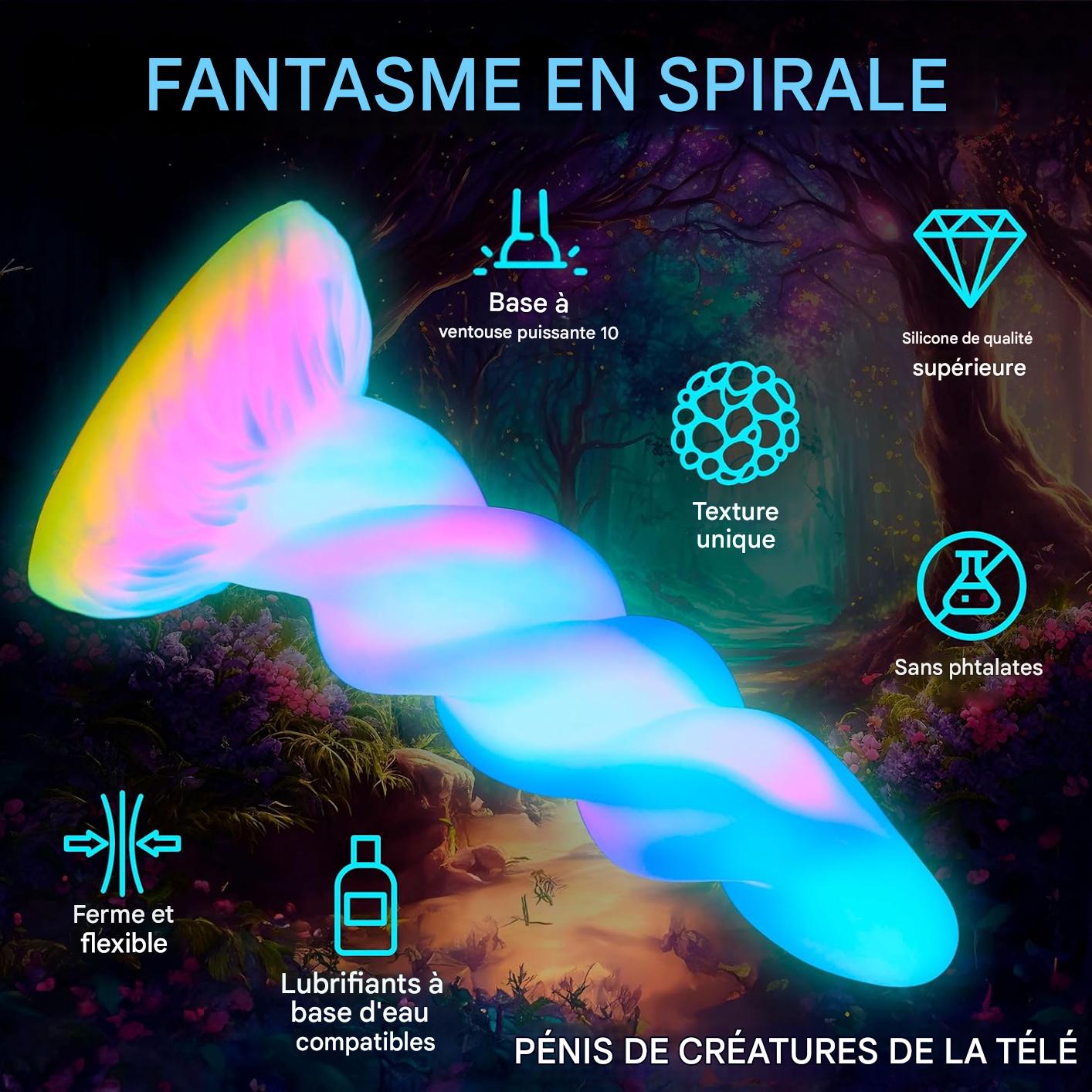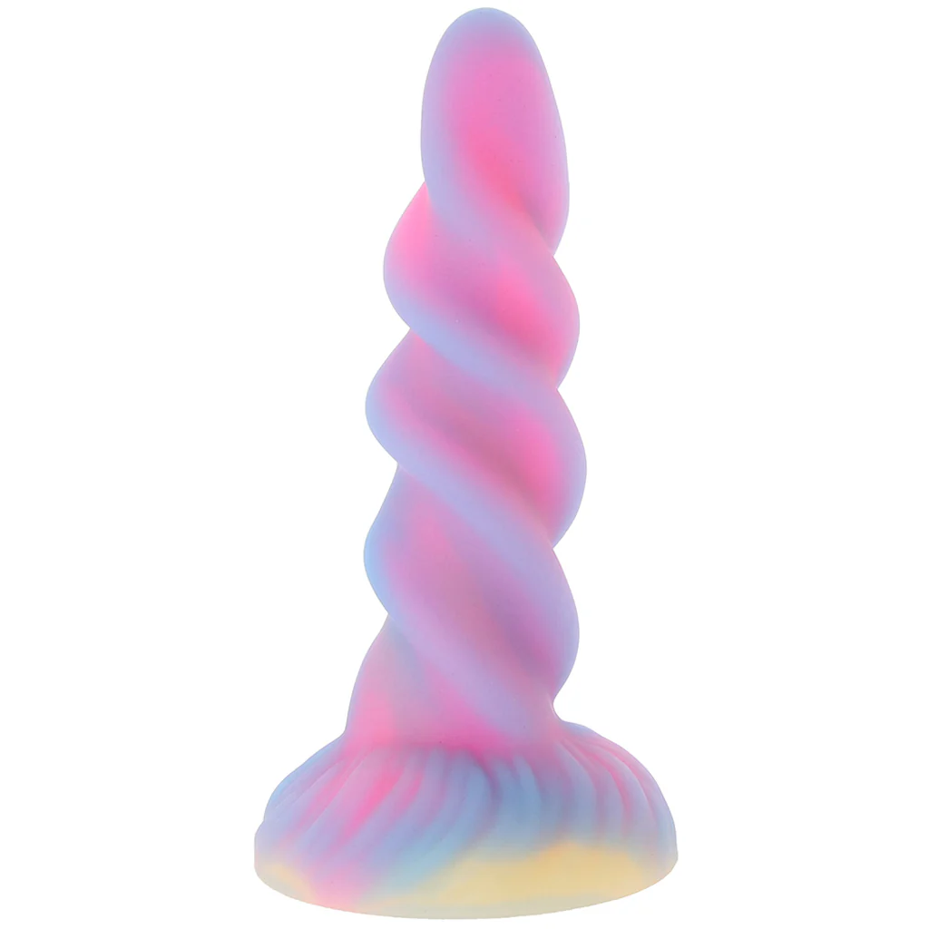 Glow-in-the-dark Moon Rider monster dildo. Made of body-safe silicone with a strong suction cup. Textured spiral design for intense, fantasy-inspired sensations.
