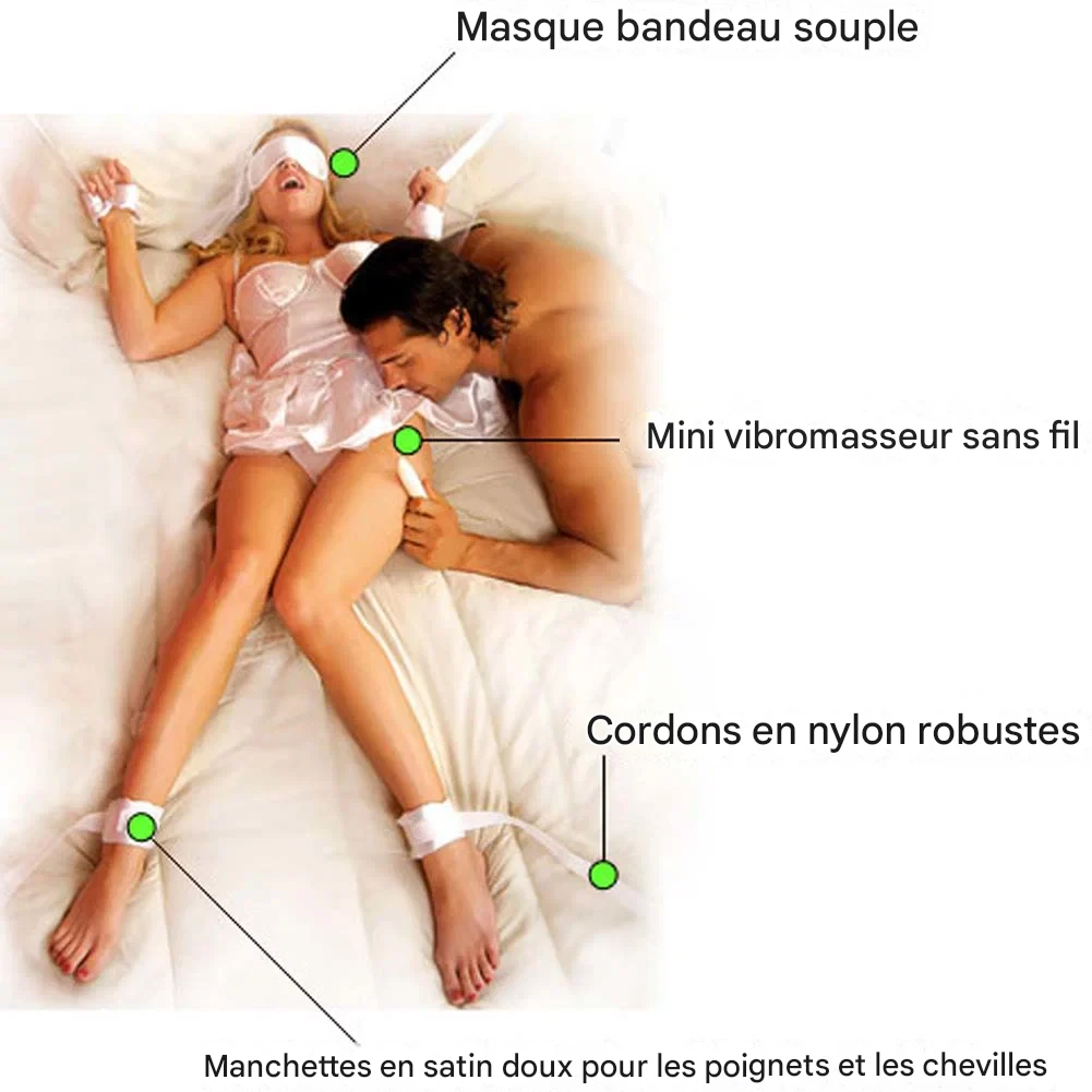 First, this romantic couple’s set includes 4 nylon restraints with adjustable satin wrist and ankle cuffs. Their soft and comfortable design makes light bondage play easy and enjoyable, while maintaining a pleasant feel on the skin. This makes the kit ideal for those wishing to discover this kind of accessory in a simple, comfortable way.