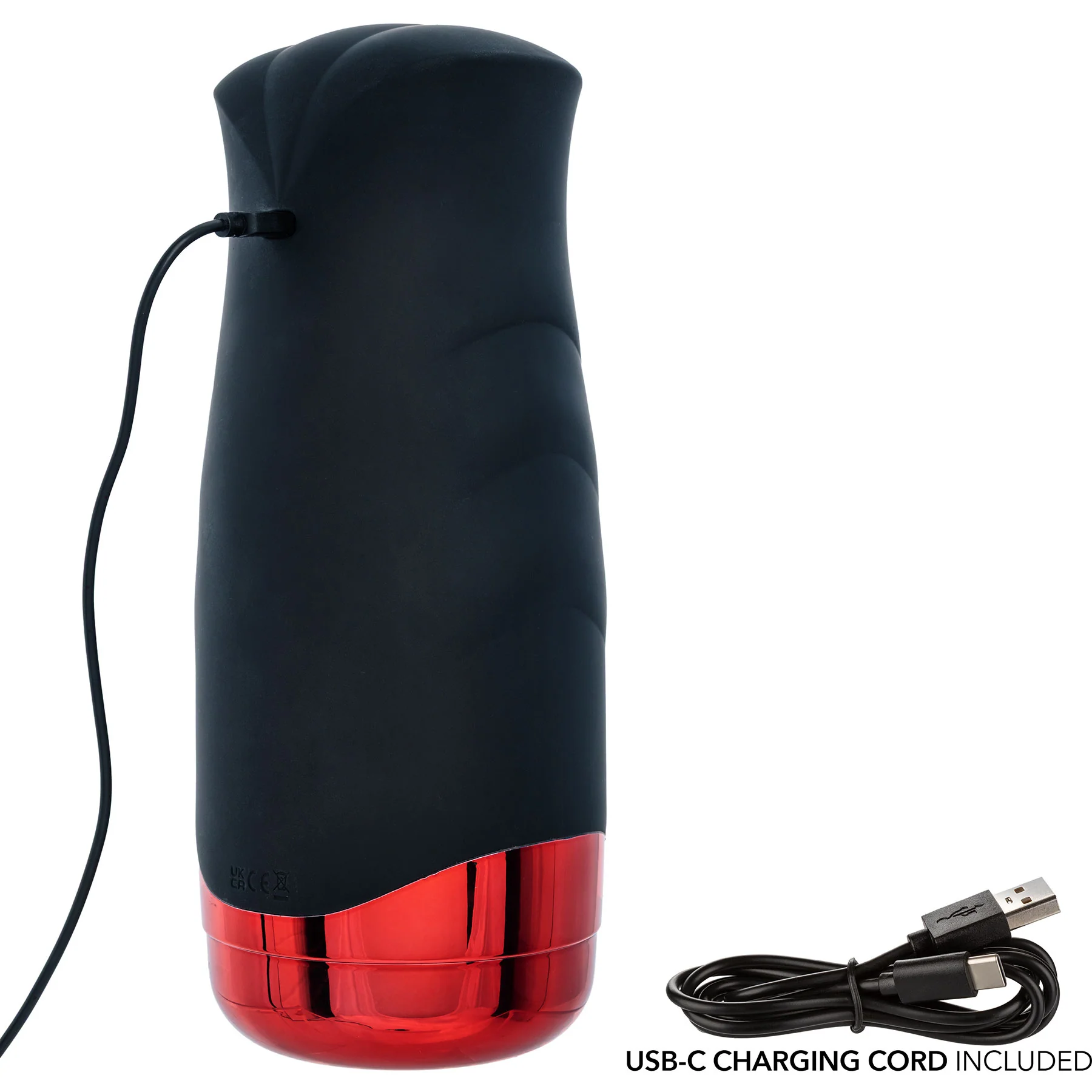 This masturbator is USB-C rechargeable, offering a battery life of approximately 55 to 120 minutes, depending on the modes used. Its sturdy case with protective cap allows for discreet and hygienic storage.