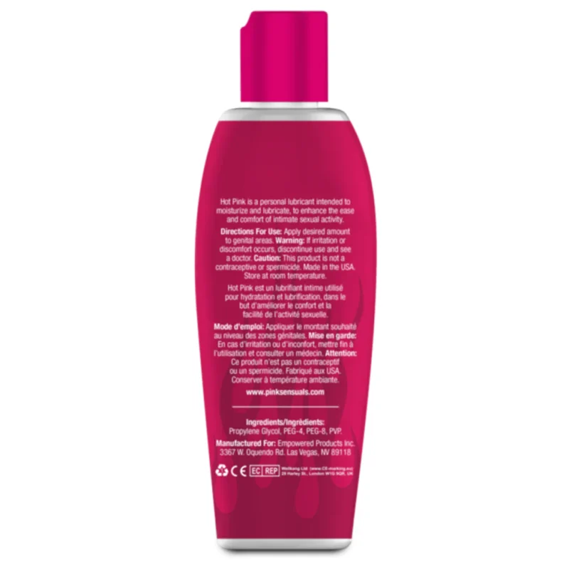 Hot Pink warming lubricant : with a water-based formula, soft progressive heat, and smooth glide. Fragrance-free, flavor-free, glycerin-free, and paraben-free for more sensual intimate moments.