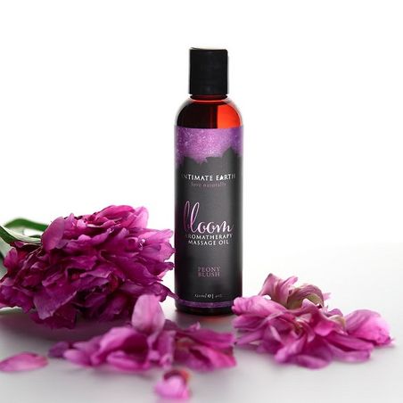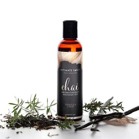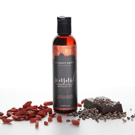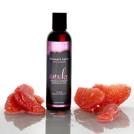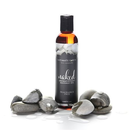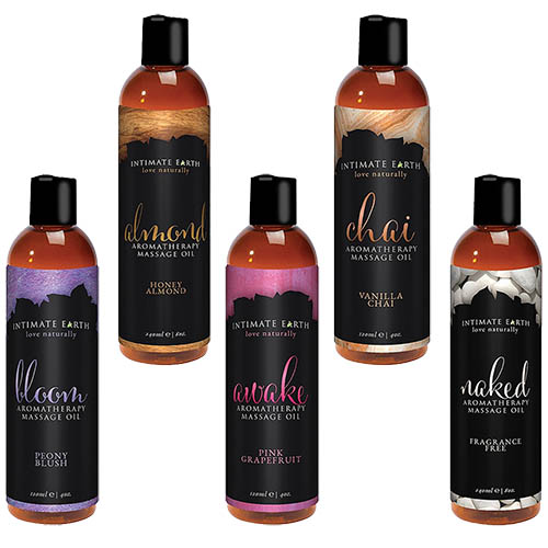 Intimate Earth aromatherapy massage oil. With organic ingredients, silky glide, non-greasy texture, and energizing scents for relaxation and skin care.