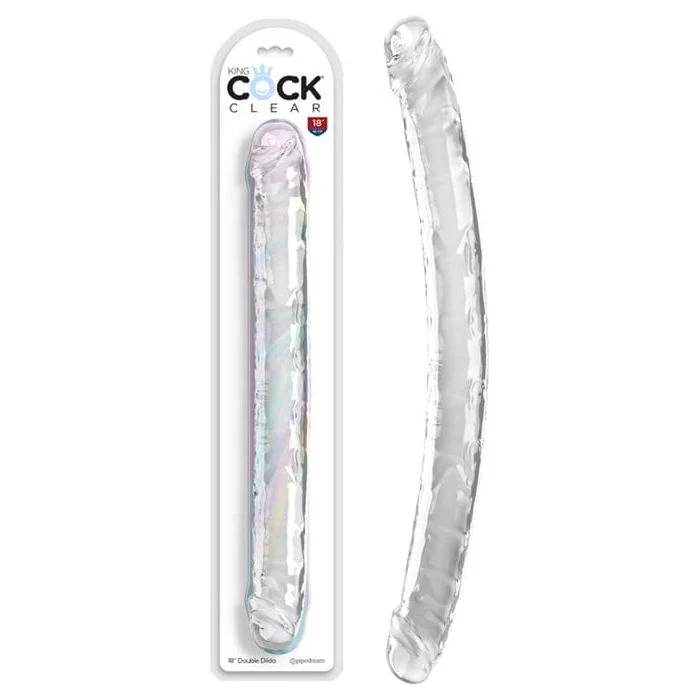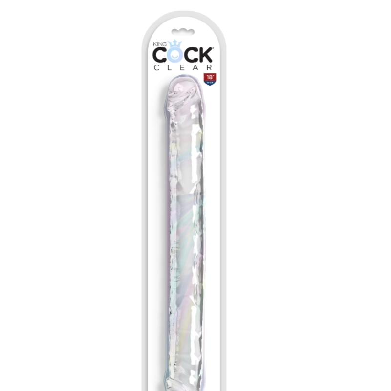 King Cock Clear Double Dildo 18″. Made in flexible TPE with realistic veins and defined head. Two ends to vary sensations, translucent design, low odor, non-sticky and easy to clean