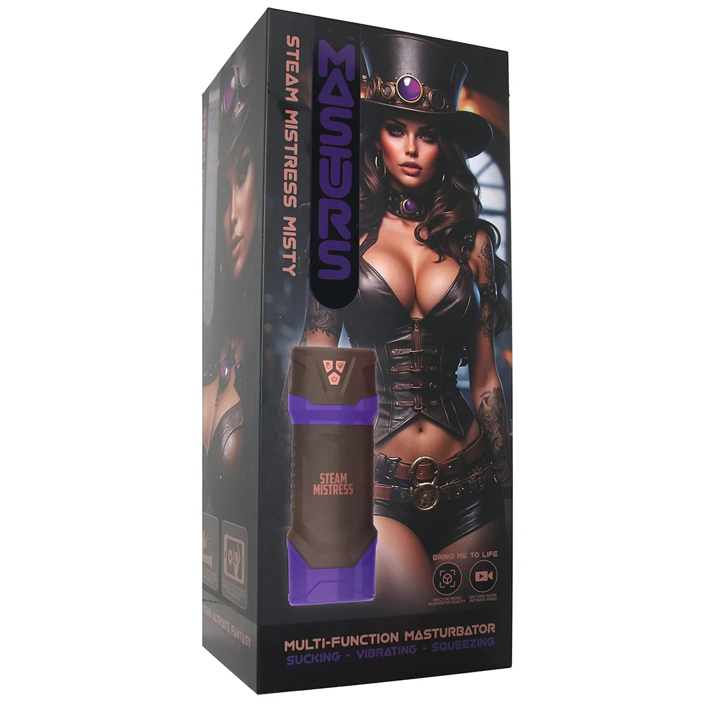 Misty Steam Mistress automatic masturbator: powerful suction, vibration and squeezing, 8,300 RPM motor, steampunk AR fantasy world and textured sleeve.
