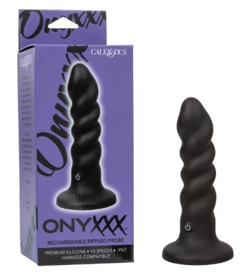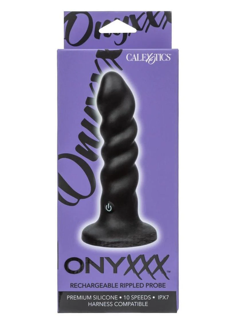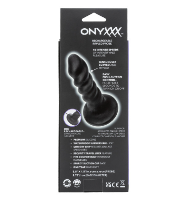 Onyxxx rippled anal vibrator. With 10 vibration speeds, hypoallergenic silicone, strong suction base, harness compatibility, IPX7 waterproof design, and USB recharge for progressive, powerful pleasure.