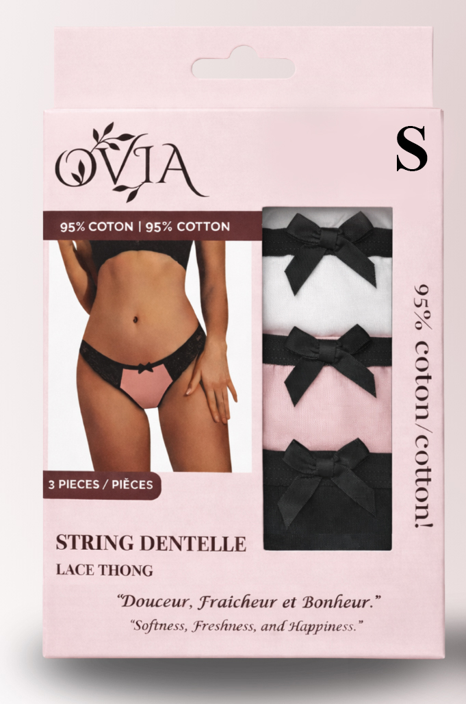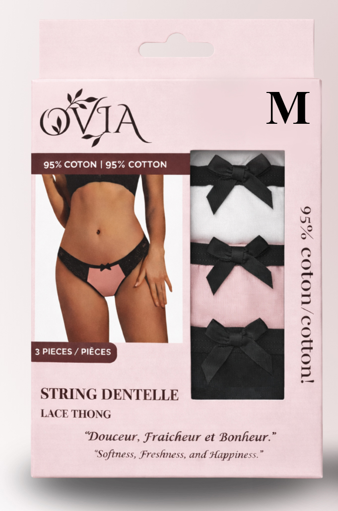 OVIA Lace and Cotton Thong Pack of 3 | Three Colors: Pink, Black, White