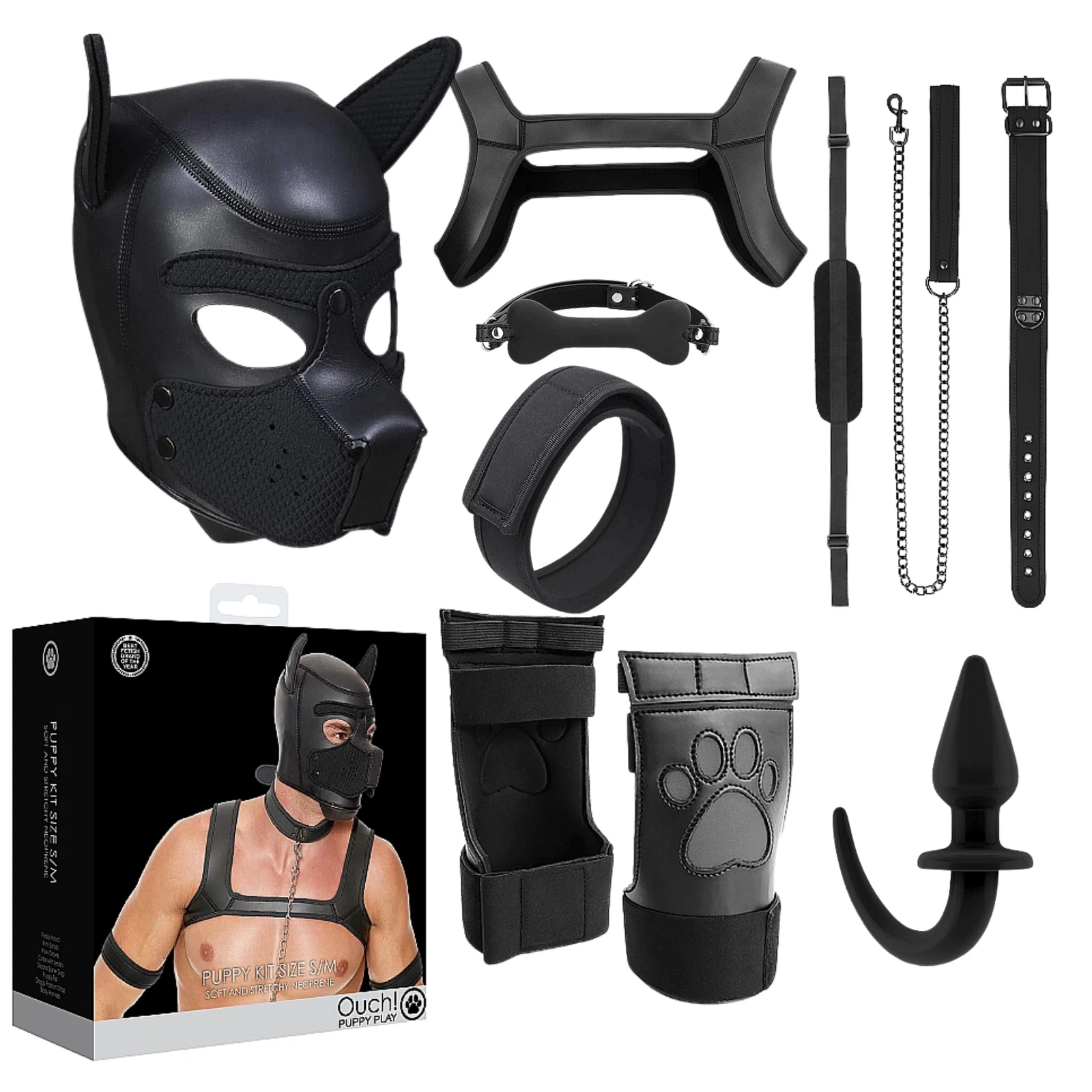 First of all, this puppy play kit includes several essentials from the collection. Inside, you will find a puppy hood, a tail, armbands, a chest harness, a collar with leash, a bone gag, a position harness, and paw gloves. Therefore, this kit allows you to create different styles of play depending on your mood and preferences. In addition, you can use one piece at a time or combine several accessories for a more complete scene.