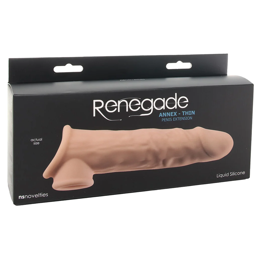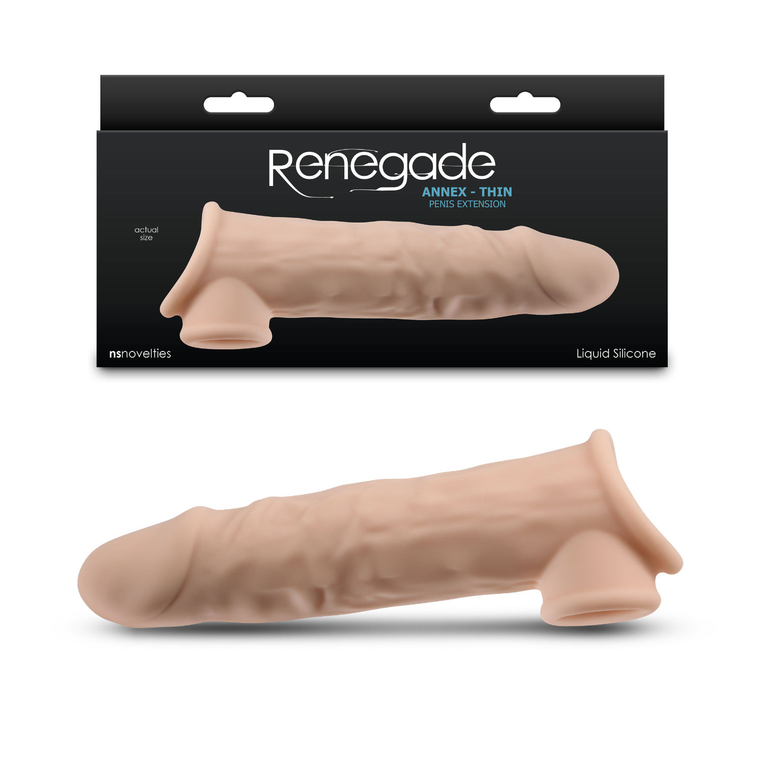 Renegade Annex thin penis sleeve. Made in ultra-soft liquid silicone adds about +5 cm (2″) length and +1 cm girth. Raised veining, integrated support ring and sturdy base with ball support