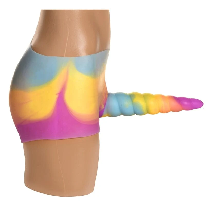 Unicorn silicone strap-on with rainbow shorts. Stretch body-safe silicone, integrated anal opening, and a textured unicorn horn dildo for playful fantasy role play.
