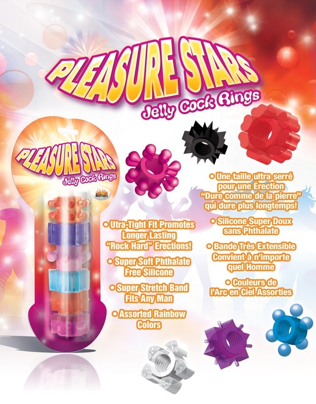 Les anneaux d’érection Pleasure Star feriont durer votre érection plus longtemps et plus dure. Ces anneaux de silicone, sans phtalates, sont souples et vont s’étirer pour s’adapter à la plupart des hommes. Chaque anneau a sa propre texture pour révéler une nouvelle sensation. Vous pouvez choisir de porter ces anneaux autour de la base et sous les testicules. Cependant, si vous décidez de jouer, votre temps de jeu va durer plus longtemps.