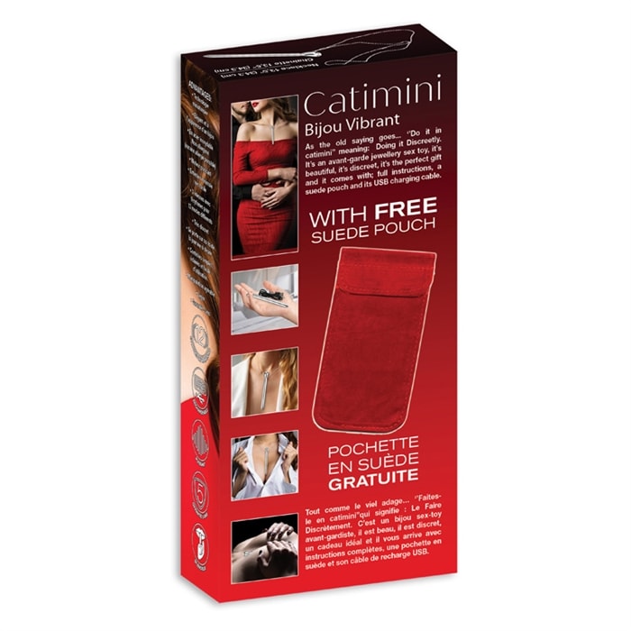 En décolleté ou en dessous de votre vêtement, il sera toujours disponible…et Catimini est si magnifique à regarder! Il se faufile tout en vibrant sans bruit, seulement vous saurez que vous l’utilisez. Un bouton situé sur Catimini, contrôle 12 modes de vibrations. En marche, une lumière blanche s’illumine. Catimini, c’est votre parfait Bijou-Vibrant mobile et rechargeable avec prise USB.