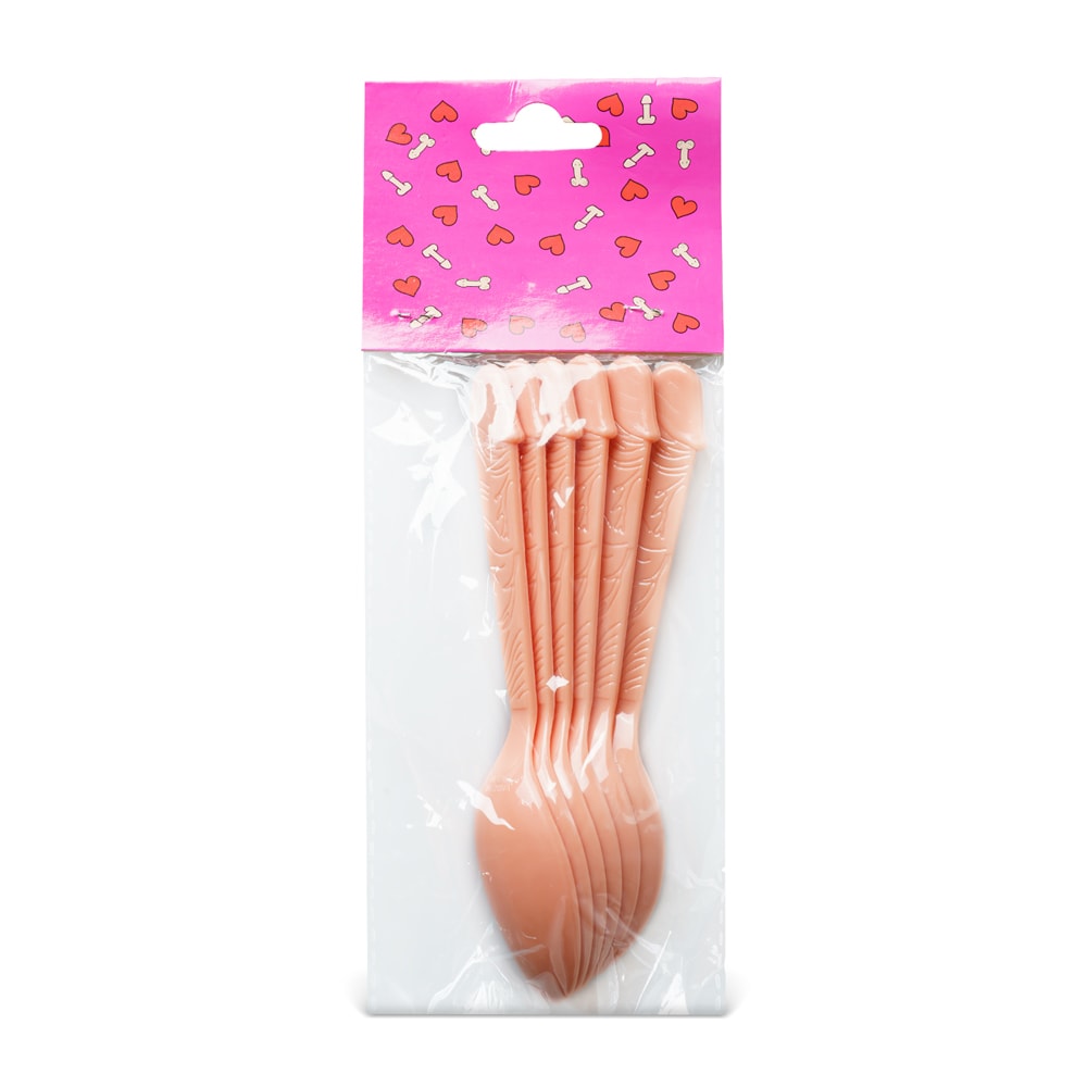 Comprend six cuillères à pénis en plastique de couleur chair.