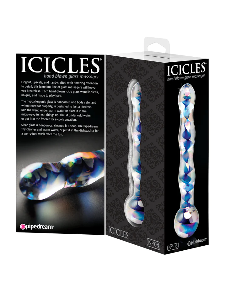 Dildo en verre Icicles 8. Élégant, haut de gamme et fait main avec une attention spéciale aux détails, cette luxueuse ligne de masseurs en verre vous coupera le souffle.
