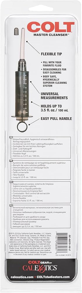 D’abord, plongez dans une expérience hygiénique et sensuelle avec la douche anale style seringue Colt, conçue pour offrir un nettoyage en profondeur et une pression remarquable. Ensuite, elle est idéale pour un usage intime. Cette seringue est parfaite pour s’amuser en mode « jeu de rôle médical » tout en garantissant une hygiène irréprochable grâce à sa conception ergonomique et ses matériaux sûrs pour le corps.