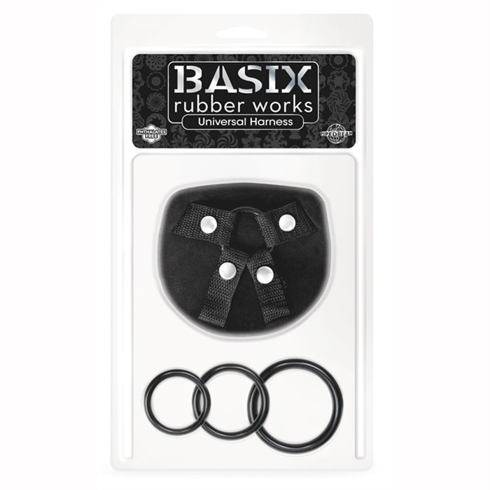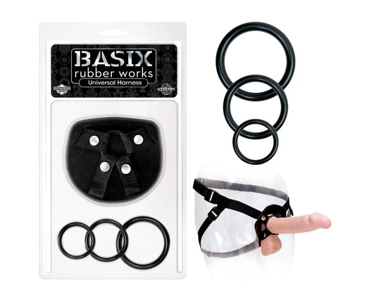 Harnais pour pénis Basix Rubber Works. Le harnais universel BASIX est disponible en grande taille ainsi qu’en taille standard et comprend 3 anneaux en silicone.