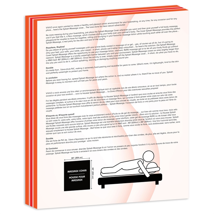 Vous rêvez de vous faire des massages avec le corps entièrement enduit d’huile ou de gel de massage ? Bien sûr comme nous tous, mais cela va salir votre lit, votre sofa, votre table, votre tapis, bref des endroits qu’on aime mieux garder intacts. Alors voici la solution : la housse Splash Massage! Splash Massage offre l’occasion d’utiliser votre lotion de massage, votre lubrifiant, votre gel de massage NURU ou de laisser aller tous vos fluides corporels sans aucune retenue. Cette housse est une barrière totalement étanche entre vous et l’endroit où vous vous trouvez. Splash Massage couvre une très grande surface, elle couvre un peu plus grand qu’un lit KING soit : 80’’(204cm) x 88’’(224cm). Une fois l’activité terminée, essuyez simplement la housse Splash Massage…Bref faites ce que vous avez à faire, comme vous voulez le faire, sans éclabousser, sans tacher, sans abîmer quoi que ce soit.