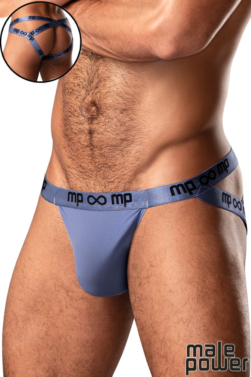 Jock en mince tissu moulant pervenche de Male power. Jock en mince tissu moulant très léger extensible avec de large tailles élastiques doubles lustrées croisées au dos.
