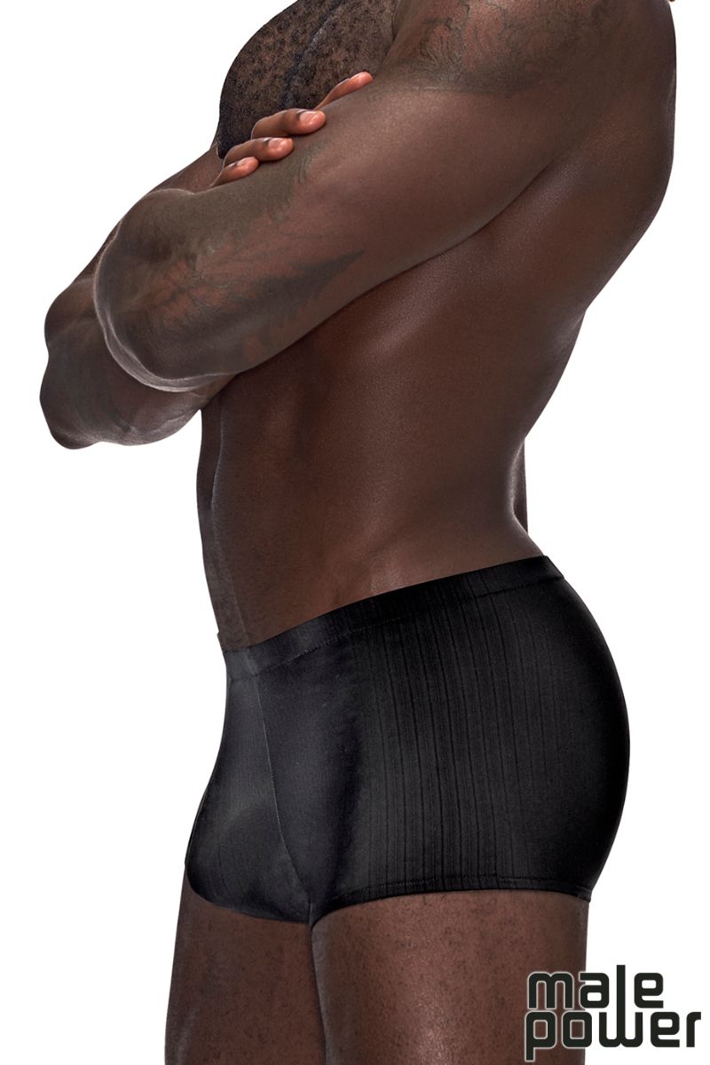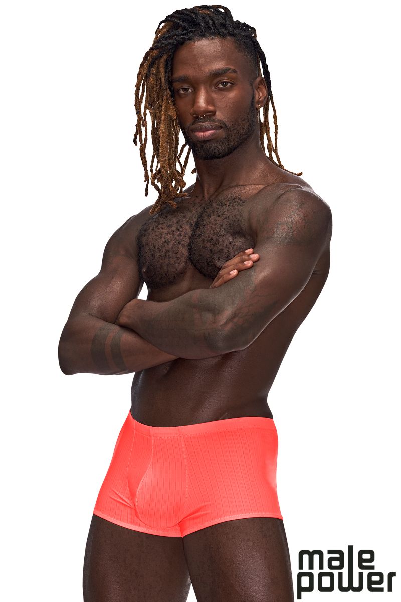 Mini short doux et satiné de Male Power. Mini short doux et satiné avec une poche enveloppante et une taille basse élastique. Choix de deux couleurs noir et corail.