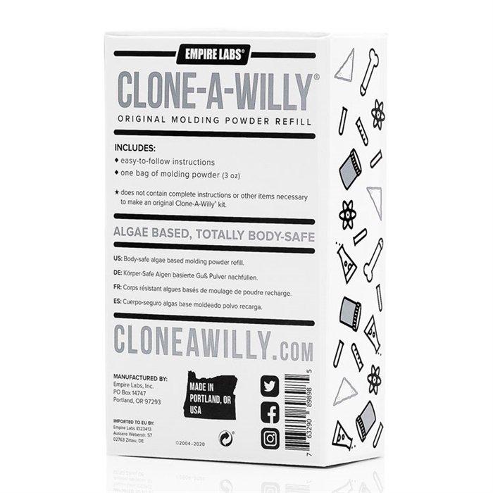 La recharge Clone-a-Willy contient trois oz de poudre de moulage sans danger pour le corps, suffisamment pour créer un clone supplémentaire. Il est conçu pour être utilisé avec un kit Clone-a-Willy. La recharge n’est pas destinée à être utilisée seule.