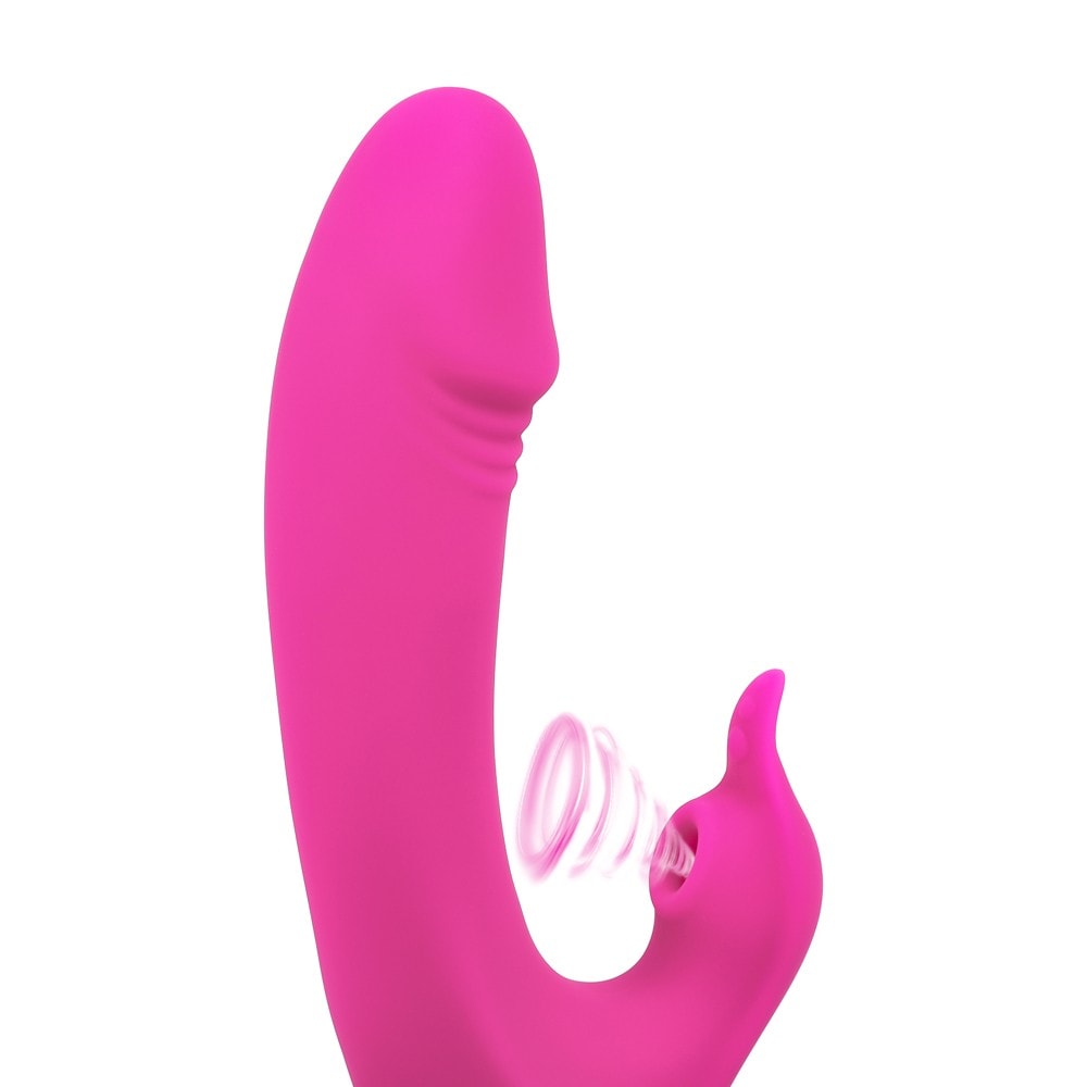 Vibrateur lapin rose rechargeable avec succion pour clitoris. Vibrateur double action en silicone de première qualité avec un pénis recourbé pour faciliter la recherche du point g et un stimulateur pour clitoris avec succion intégré.