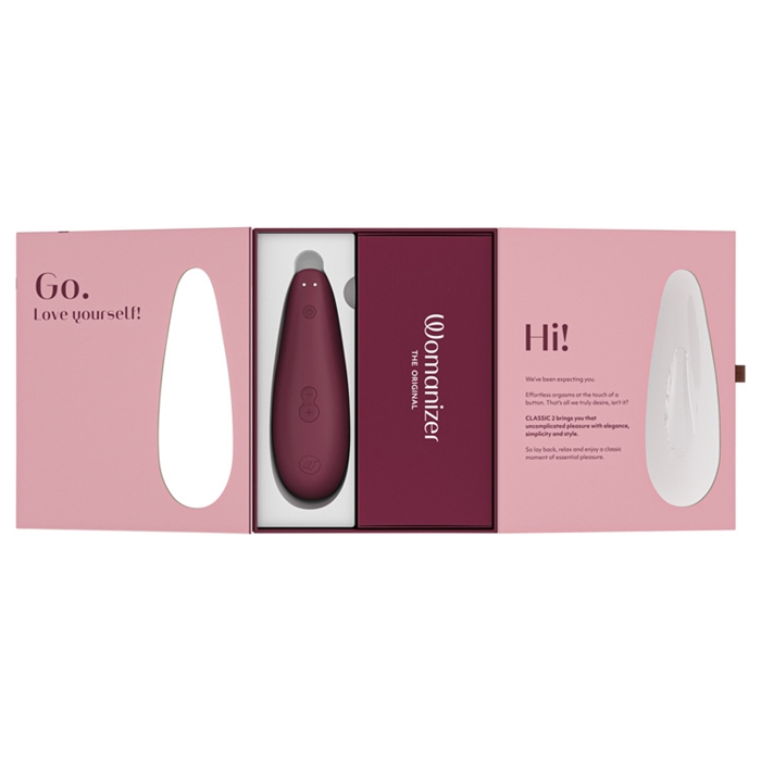 Womanizer Classique 2 bordeaux stimulateur pour clitoris. Le Womanizer Classique 2 Bordeaux possède 10 niveaux d’intensité, rechargeable, et est entièrement submersible pour le bain ou la douche. Ce produit est livré gratuitement partout au Canada avec votre choix de cadeaux!