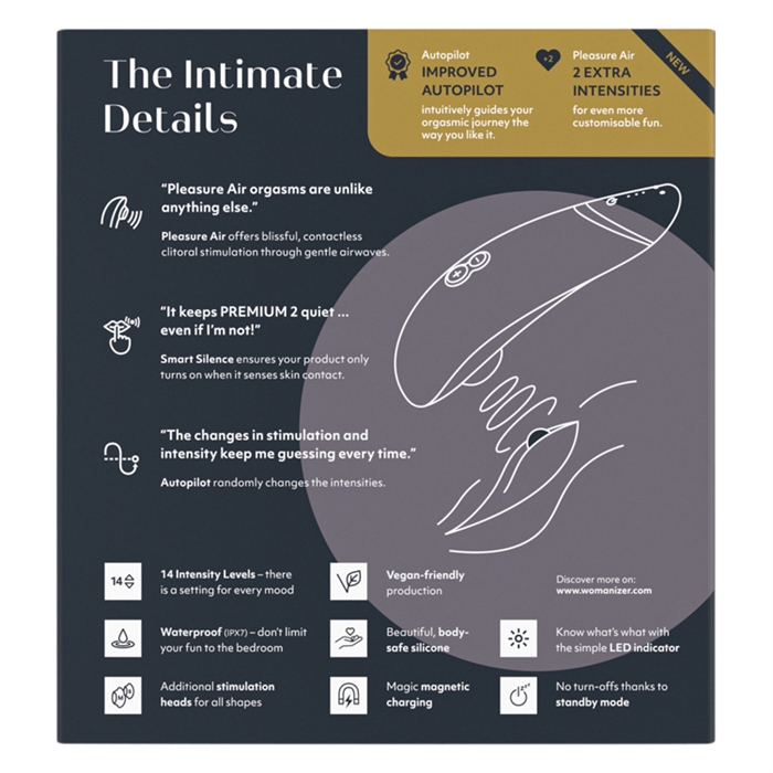 Le Womanizer Premium 2 noir est le jouet érotique Pleasure Air le plus luxueux jamais conçu. Le design du produit phare de Womanizer a été amélioré en se basant sur les rétroactions récoltées auprès de plus de 1600 utilisateurs afin de garantir l’expérience la plus satisfaisante qui soit. Le silicone ultra doux de la plus haute qualité crée un contact délicat et soyeux, et les 14 niveaux d’intensité garantissent des transitions et un contrôle tout en nuances et en douceur. Le mode Autopilot permet aux utilisateurs de vraiment se laisser aller.