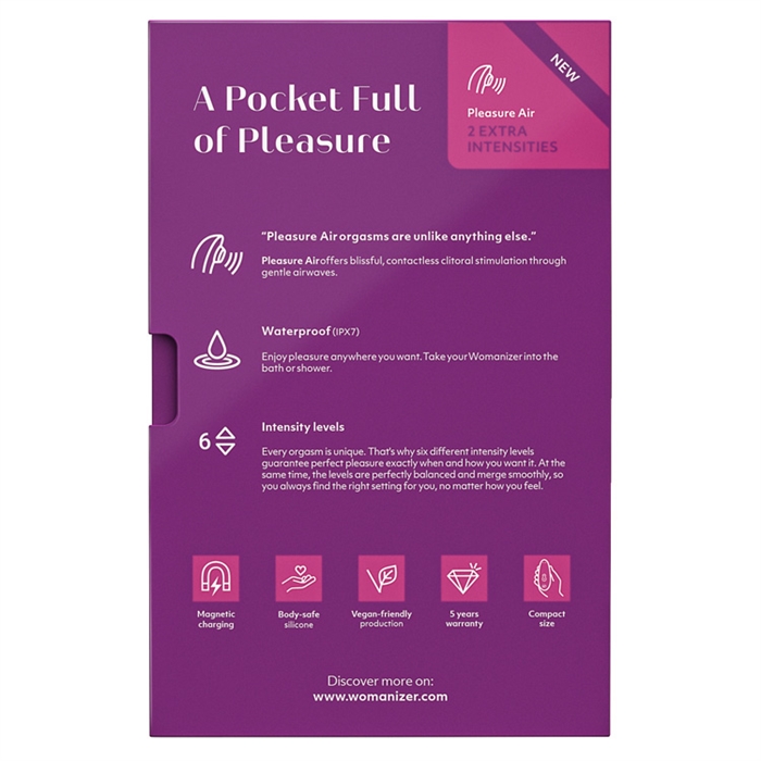 L’invention révolutionnaire de Womanizer qui a changé la donne en matière de jouets sexuels. Notre technologie originale Pleasure Air Technology offre une stimulation sans contact grâce à une légère pression d’air sur votre clitoris. Le résultat ? Vous avez l’impression de marcher sur l’air. Laissez les douces vibrations vous guider vers des orgasmes incroyables.