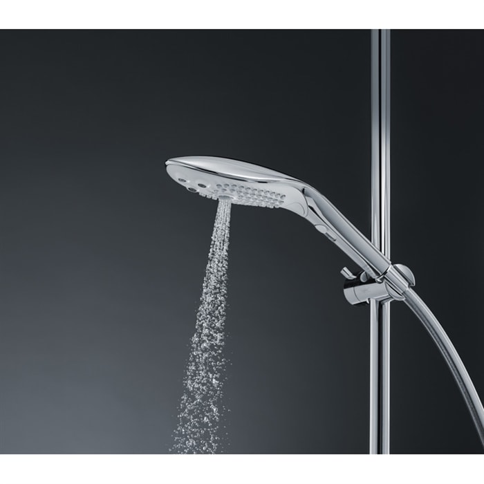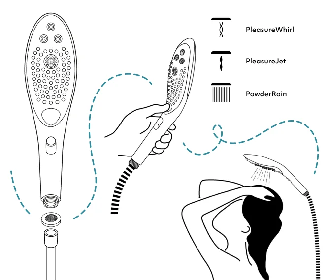 hansgrohe, leader en robinetteries. D’un geste, Womanizer Wave passe d’un pommeau de douche haut de gamme à un masturbateur qui stimule les parties intimes grâce à la pression de l’eau.