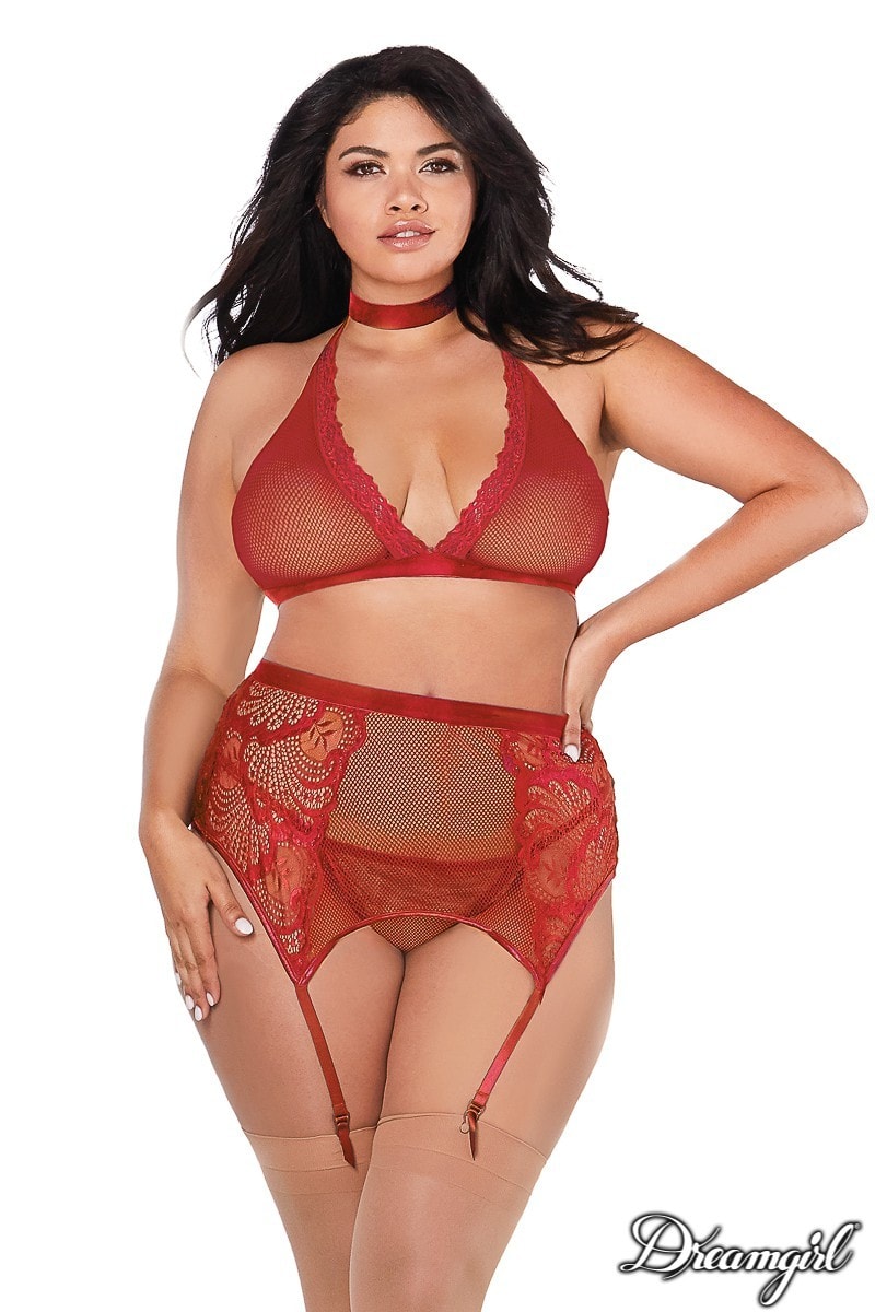 Dreamgirl queen size garnet 4 pieces set with garter belt. Halter tie-neck fishnet bralette with a lace trim, a silky underbust and an hook & eye back closure. Embroidered fishnet garterbelt with adjustable plastic garters, an open back and an adjustable waistband. Velvet choker necklace with a tie-neck closure and fishnet G-String.