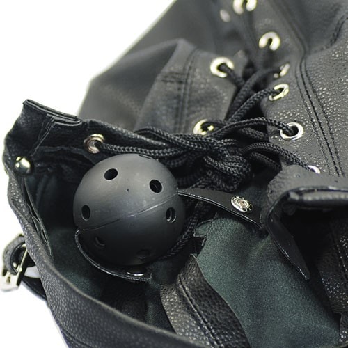 Luxury hood with mask and gag ball. Penetrating a deeper, darker plane of bondage and fetish play, this deluxe hood is a full-coverage headpiece that conceals the face while leaving your eyes wide open or closed if using the mask. Fastens with lace and strap for maximum grip. The faux leather hood easily adapts to the perfect fit with a corset-style lacing. Ball gag and mask included. Universal size.