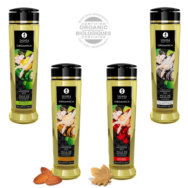 Shunga Organica massage oil available in 4 fragrances. Shunga Organica massage oil available in 4 fragrances to give or receive a relaxing massage interspersed with caresses!