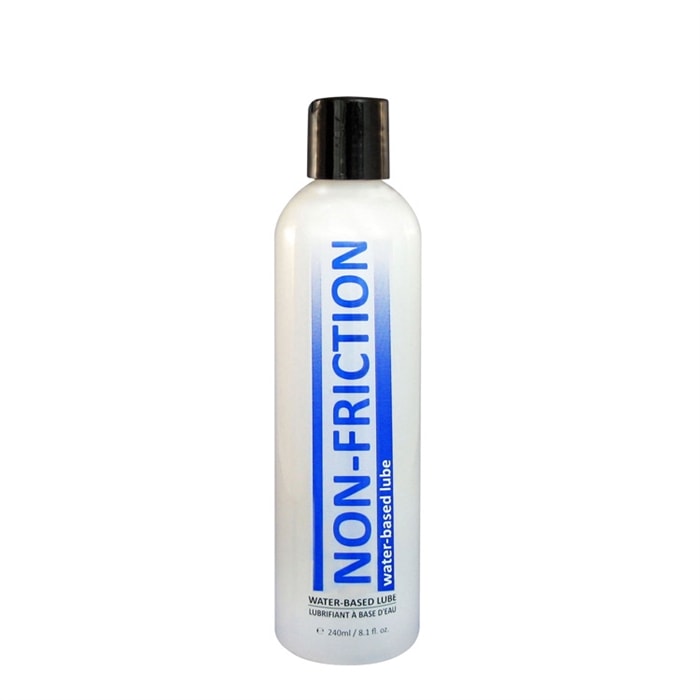 Non-Friction water-based white lubricant. Non-Friction water-based white lubricant reduces friction without removing the spark. Compatible with both latex and polyisoprene condoms.